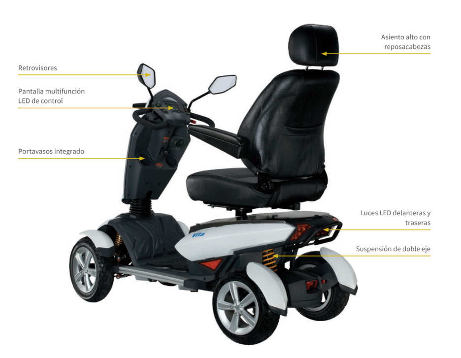 Equipada amb un motor de 700 W i dues bateries de 80 Ah, la I-Vita ofereix un rendiment excepcional, que li permet afrontar trajectes llargs i pendents on altres scooters no arriben. La seva suspensió de doble eix, juntament amb un seient ergonòmic amb reposacaps i columna de conducció regulable, garanteixen una conducció suau, estable i molt còmoda.